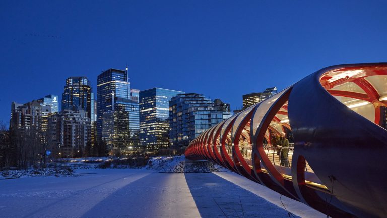 Even the skyline joins in. After sunset, TELUS Sky becomes a digital canvas for Douglas Coupland’s Northern Lights bathing downtown in waves of colour that echo the aurora. The Peace Bridge, by Santiago Calatrava, arcs across the Bow River like a red ribbon of movement that is lit up and busy with people in summer evenings. Photographers around the world agree the Peace Bridge is both architecture and sculpture at once.